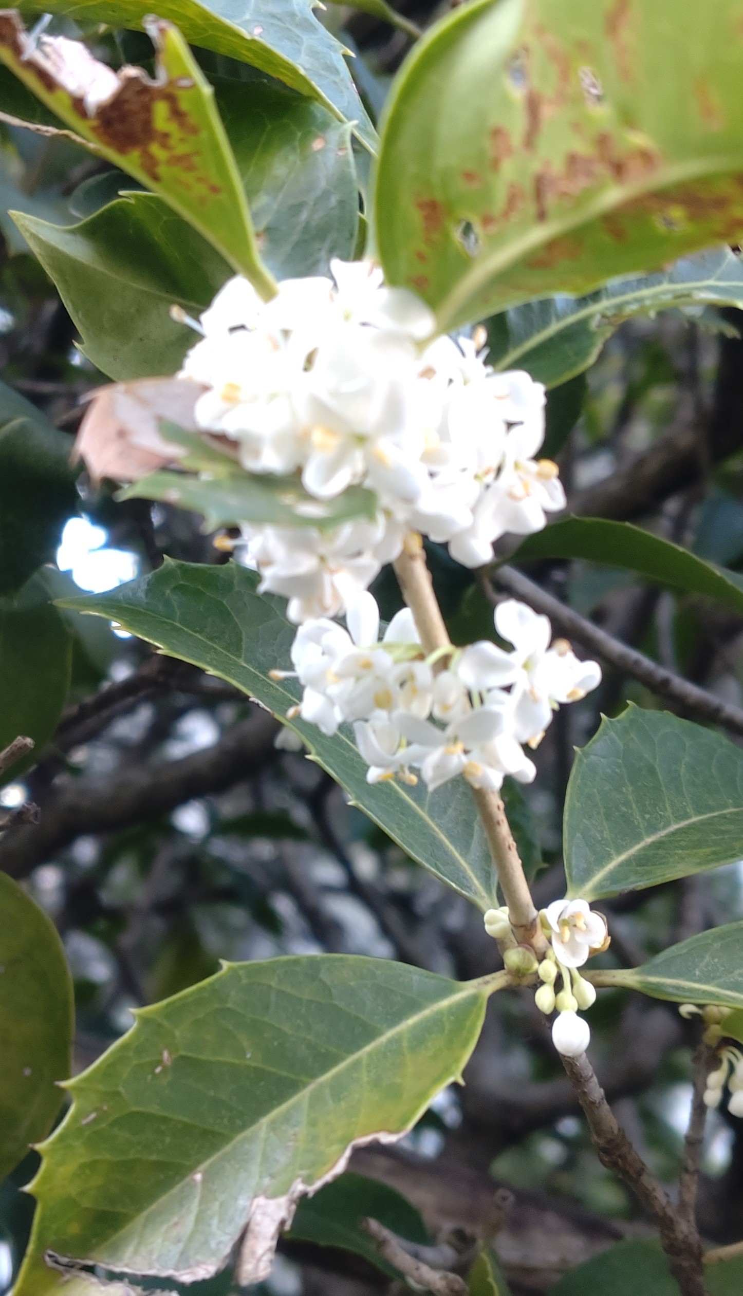 今朝、通勤の道で、ギンモクセイ(キイラギの花)が咲いていました。